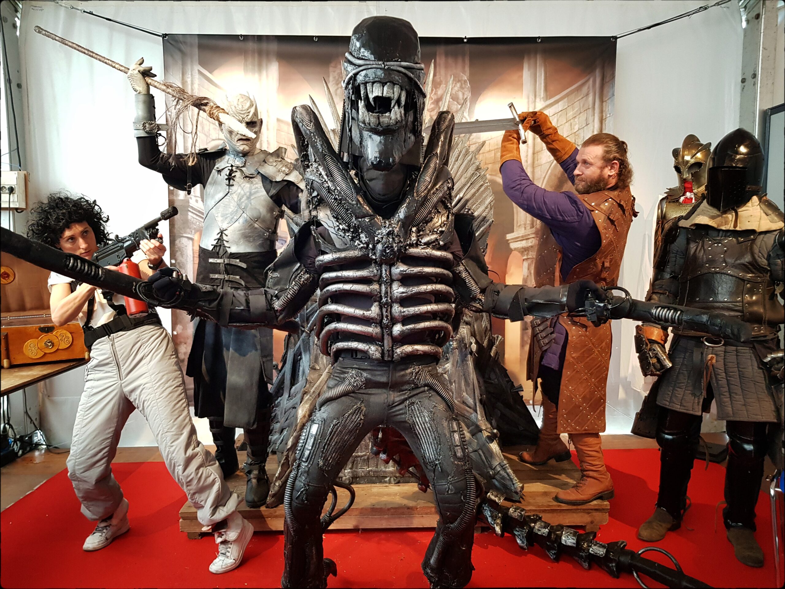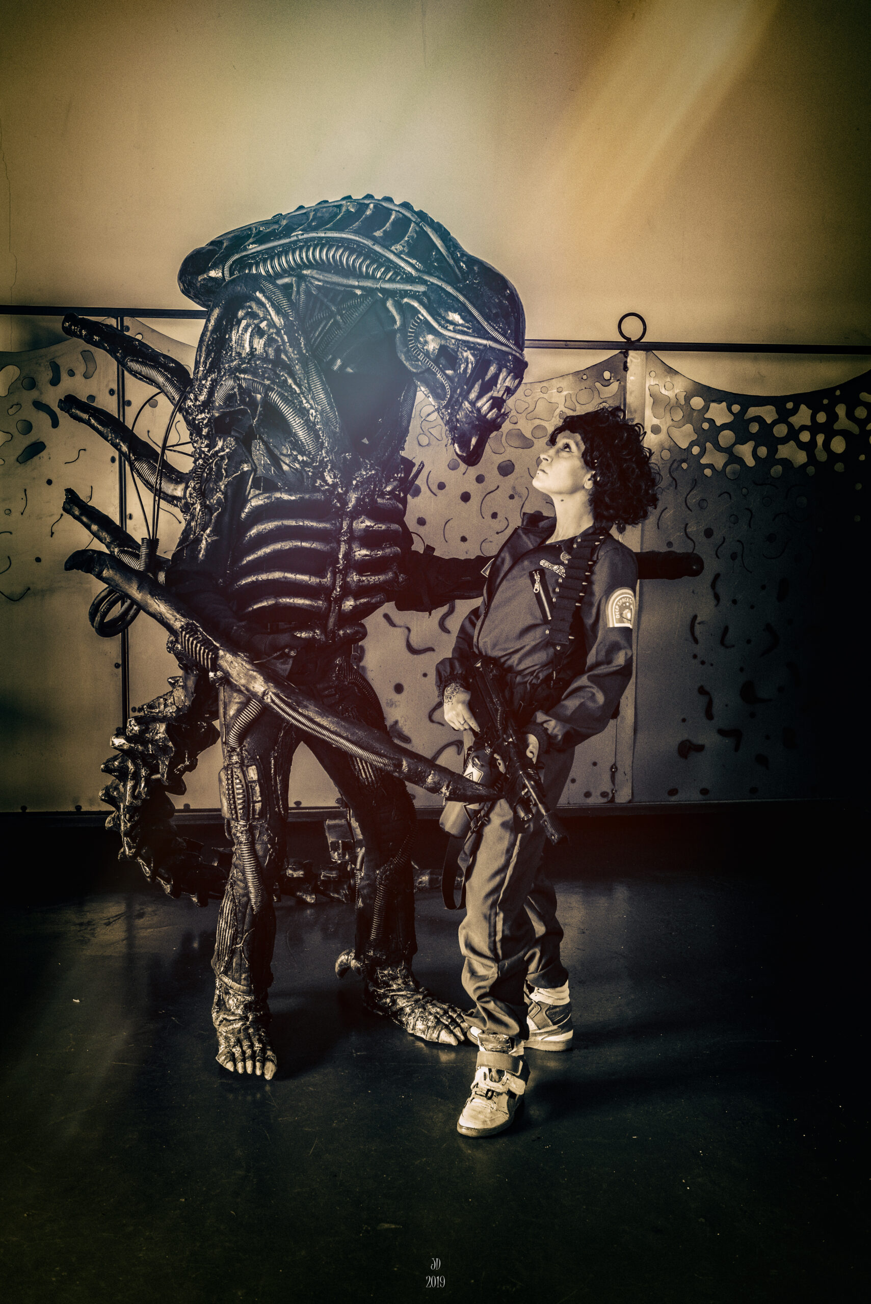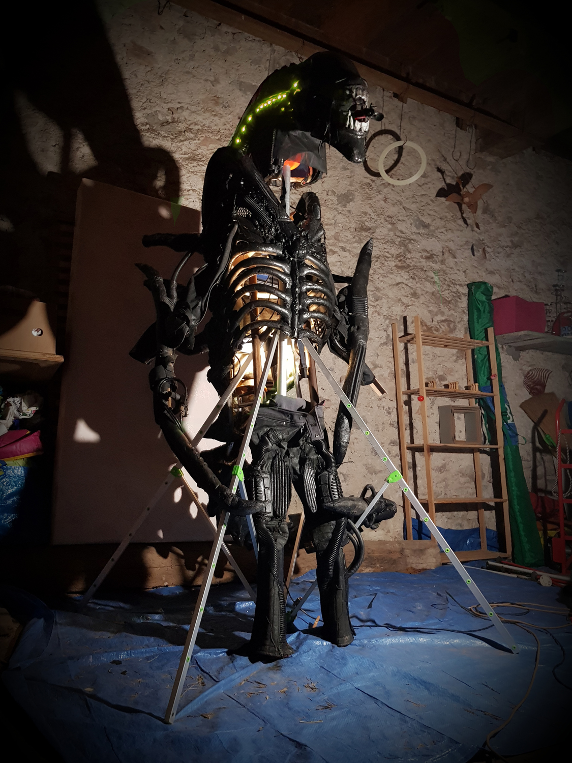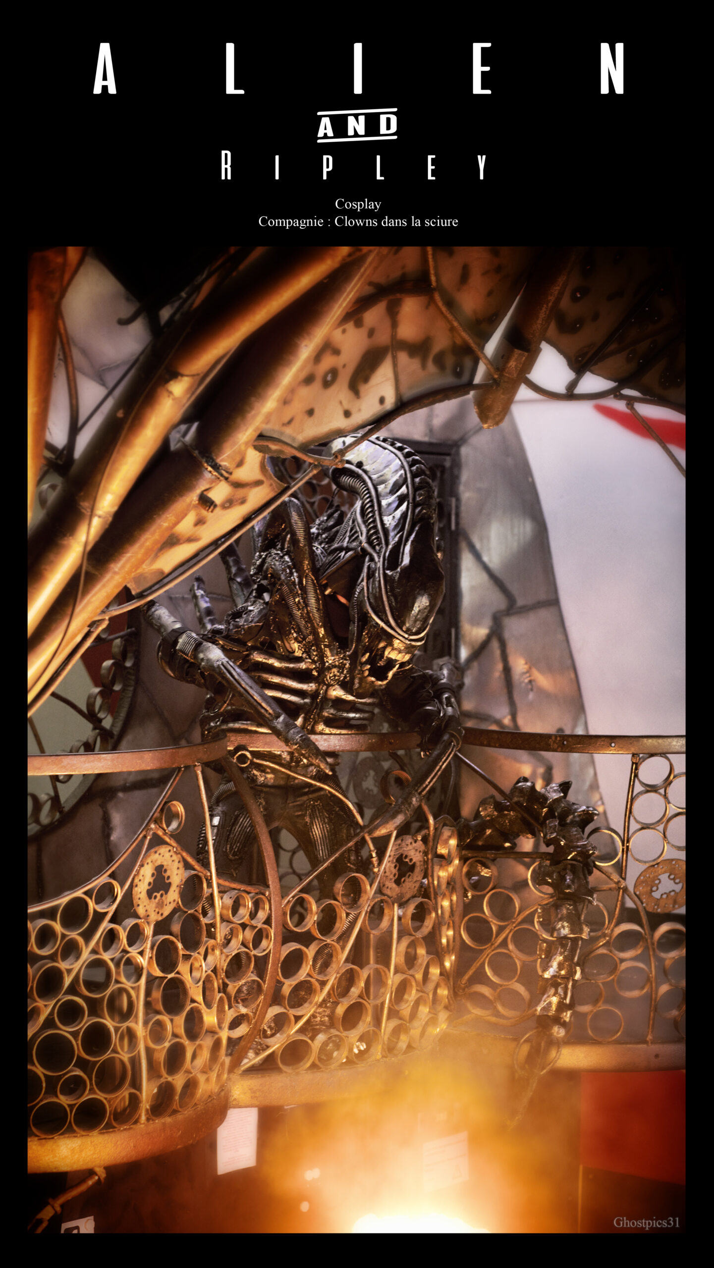 Alien & Ripley proposent une performance hybride entre spectacle déambulatoire, cosplay et arts du feu. L’exosquelette Alien – conçu comme une sculpture articulée – impressionne par sa présence et son réalisme. Il se déplace, grogne, ouvre sa mâchoire et crée une véritable atmosphère cinématographique. Ripley, quant à elle, offre un numéro de feu saisissant qui illumine cette confrontation iconique.