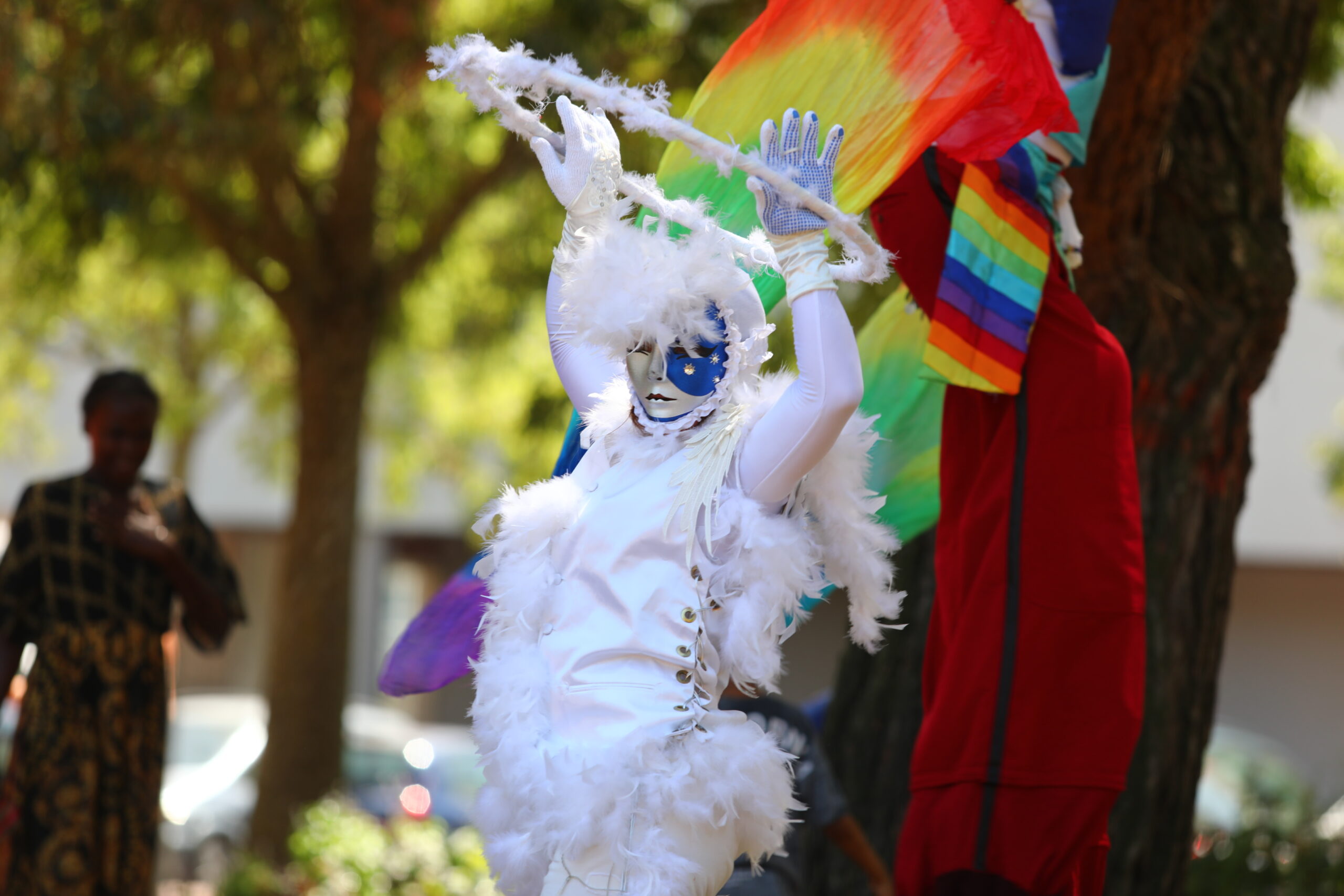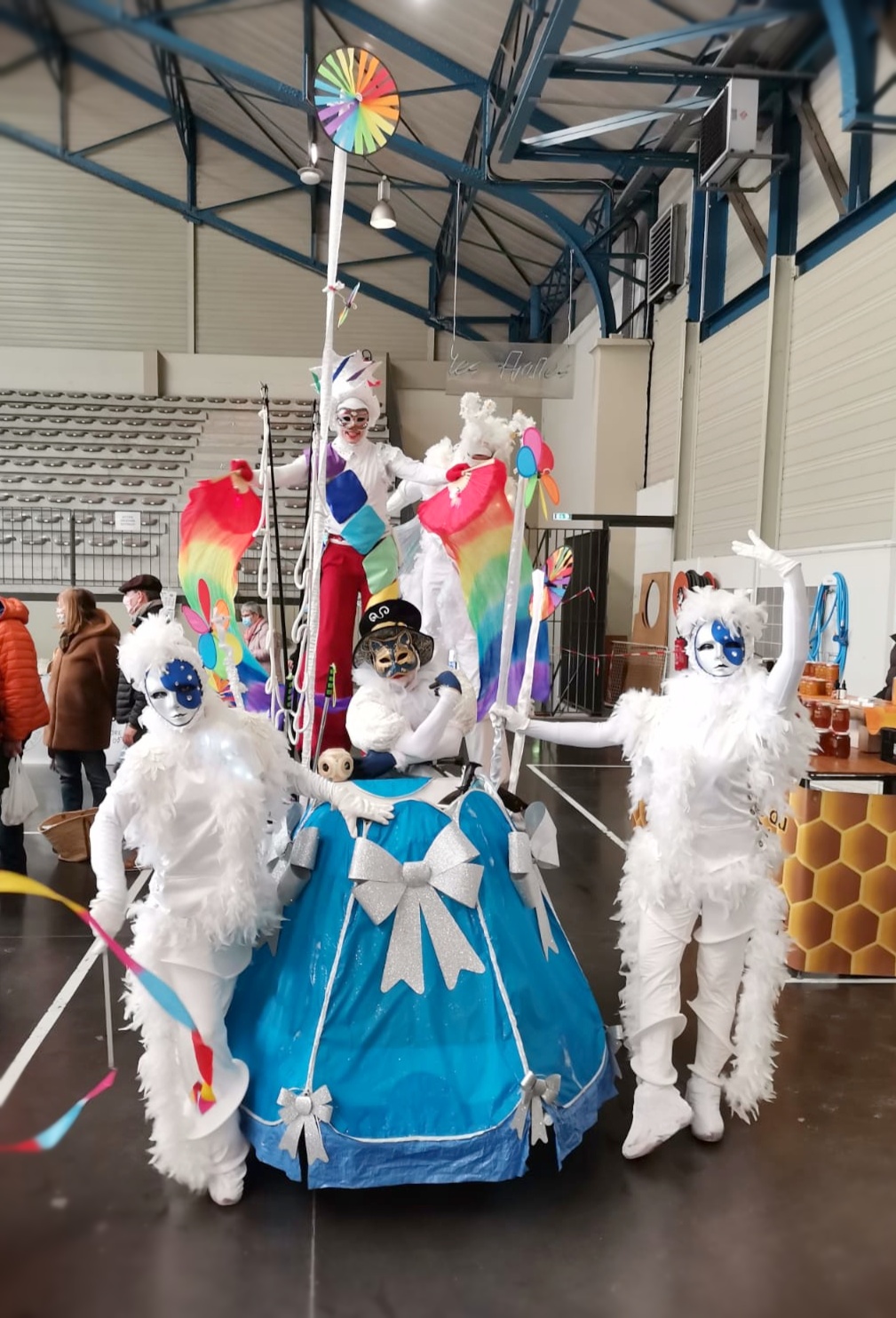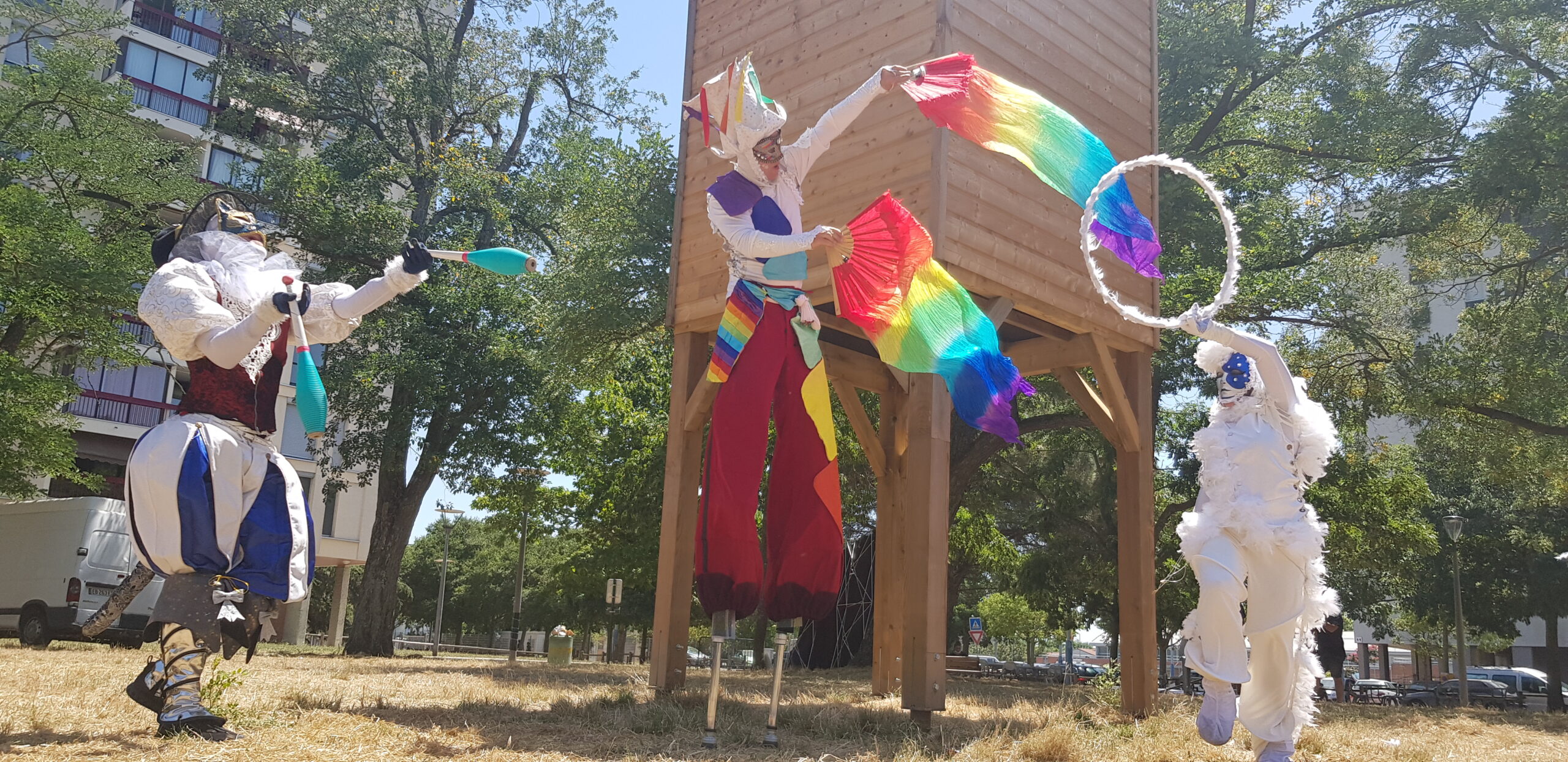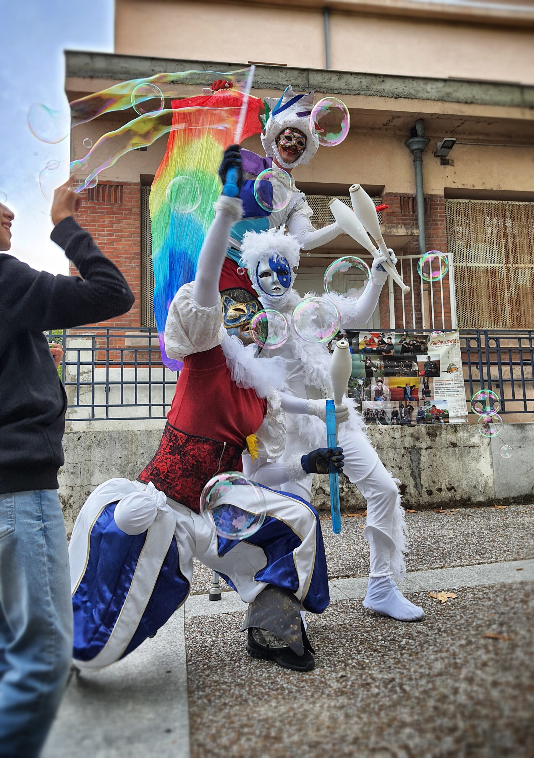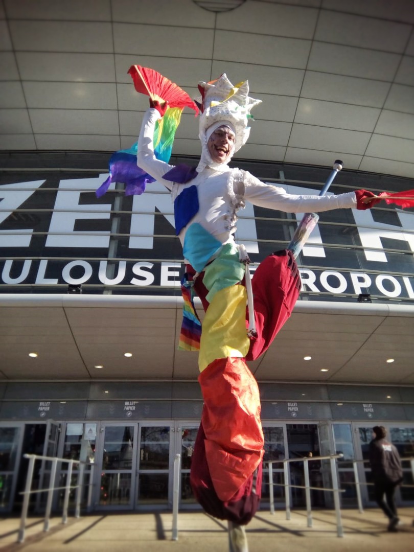 Rempli de joie et de couleurs, l’Homme Arc-en-Ciel est un échassier sauteur et danseur pas comme les autres. Accompagnées de ses Anges bienveillants, deux siamoises envoûtantes, jongleuses et bulleuses, il vous guide dans une vague de douceur, de pureté et d’émerveillement.