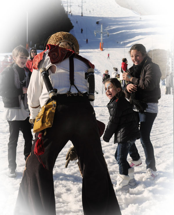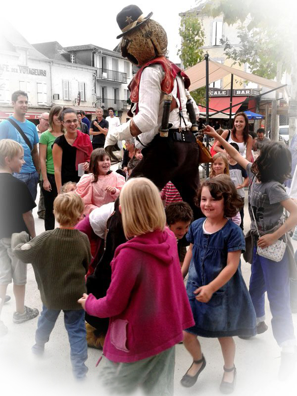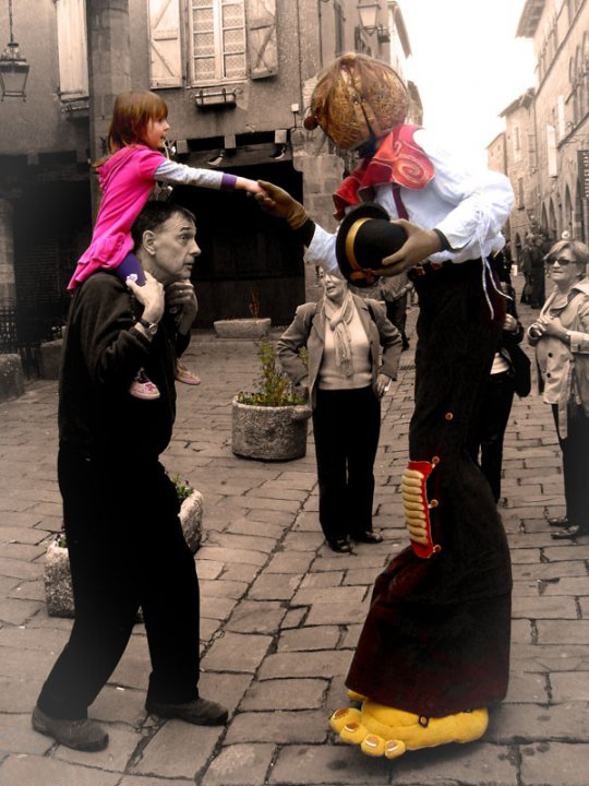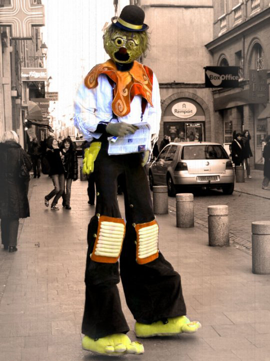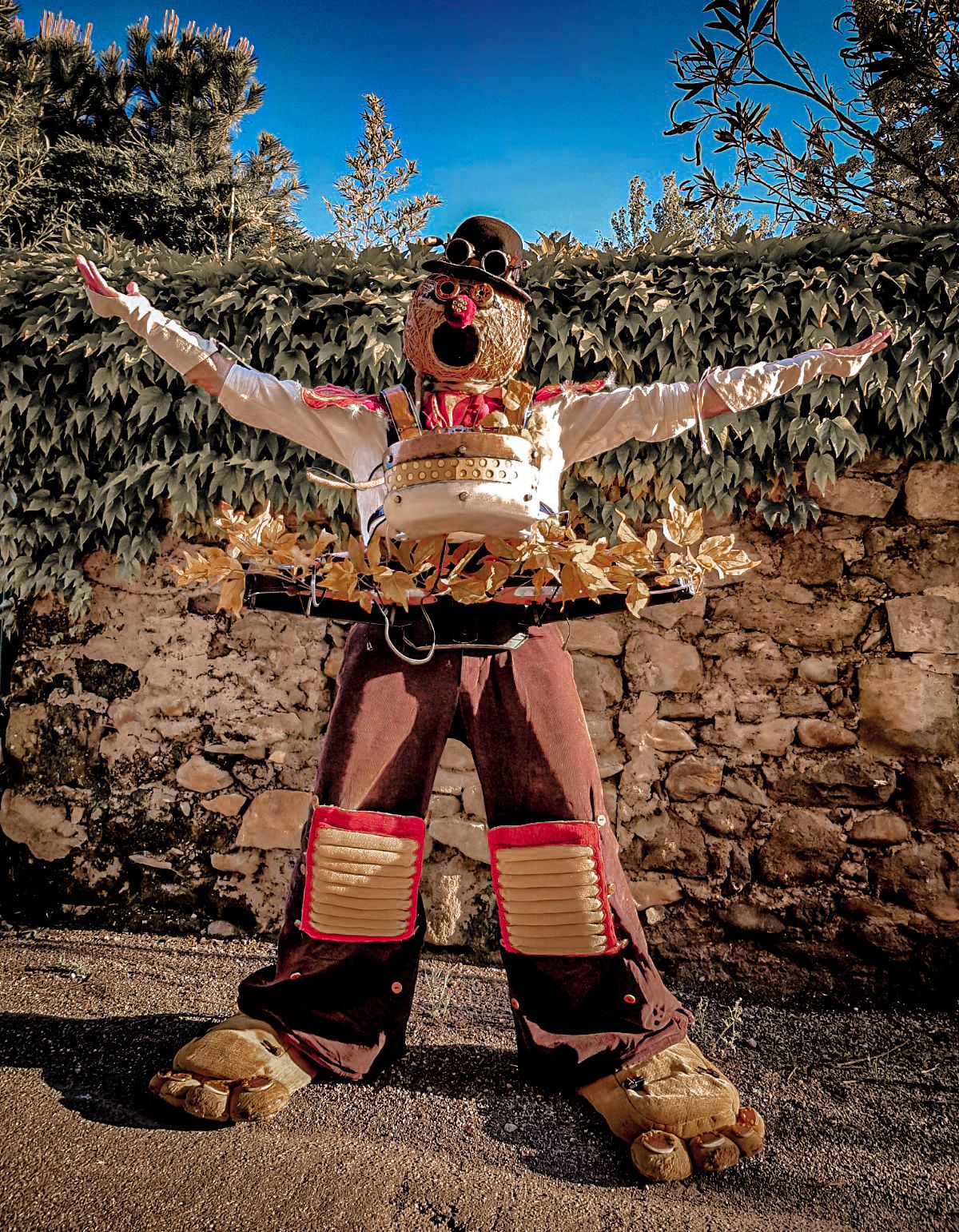 Déambulant au sol ou perché sur échasses, il diffuse une atmosphère douce, mystérieuse et chaleureuse, évoquant à la fois l’univers de Tim Burton et la magie des contes de Grimm et de Perrault.