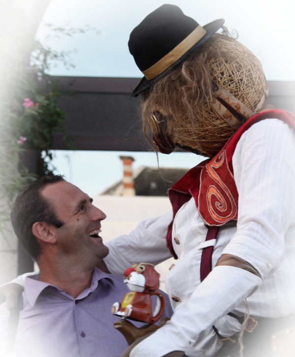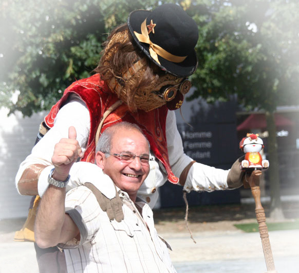 Attachant, joueur et toujours souriant, il fait apparaître des bonbons par magie depuis son chapeau et partage sa joie contagieuse avec les passants. Son humour tendre, sa musicalité et sa fantaisie transforment chaque rencontre en un moment suspendu, où les enfants s’émerveillent et les adultes retombent en enfance.
